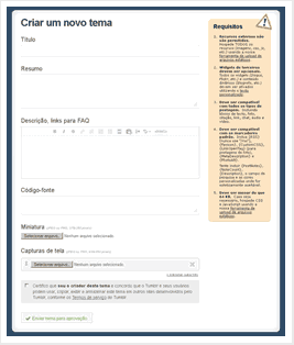 - Uma nova página será aberta onde será possível criar um tema no Tumblr e enviá-lo para aprovação. Os passos são simples de serem seguidos, basta adicionar um título nome para o novo tema, adicionar um resumo e descrição. Quando terminar, será necessário colocar o código do tema criado por você.